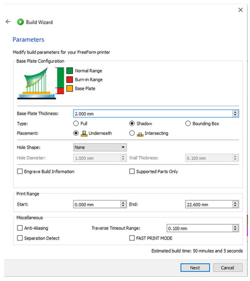 Asiga Composer—selected parameters for printing on the Build Wizard 3D printing software.