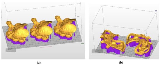 STL reference images in ASIGA MAX UV slicing software containing implant surgical guides with support structures in place. (a) Upper; (b) lower.