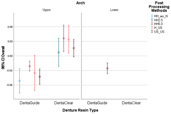 Lastly, samples post-cured without nitrogen were significantly (p < 0.05) the least accurate of all the printed guides, with a trueness of −42 µm and precision of −68 to −39 µm (Table 3 and Table 4 and Figure 5).