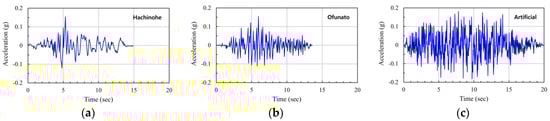 A time history analysis method was applied for the dynamic analysis. Three types of seismic waves were used as the input seismic waves: Ofunato and Hachinohe waves, i.e., representative short-period and long-period seismic waves widely used in dynamic analysis, respectively, and artificial waves generated by reflecting the characteristics of the Wonjucheon dam site (Figure 5). In the analysis domain, the left and right sides were fixed in the horizontal direction, and the lower part was set in the vertical direction. A viscous boundary condition was applied to show a behavior similar to reality when a seismic wave is applied by absorbing the wave reaching the boundary.