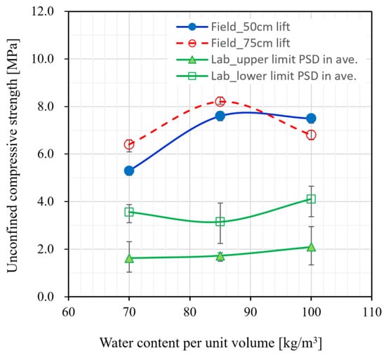 Figure 9 shows the relationship between the unit water content and dry unit weight for field-compacted hardfills, i.e., hardfills mixed on-site using the same type of aggregates with the maximum particle diameter of 80 mm as used in the indoor laboratory test by matching the PSD and mixing ratio to the laboratory test conditions (i.e., a unit cement content of 80 kg/m3 and three unit water contents of 70, 85, and 100 kg/m3) and compacted on-site using a vibration roller. The change in the dry unit weight according to the unit water content shows that the dry unit weight increases in the case of the 50 cm lift compaction but decreases in the case of the 75 cm lift compaction. Thus, it shows a difference from the results from the indoor laboratory test, in which the values gradually increased in all mixing conditions. Regarding the range of changes in the unit water content, the average dry unit weight is in the range of 2232–2455 kg/m3, i.e., generally similar to the indoor test results (2357–2468 kg/m3) but shows a slightly larger range. In particular, the difference in the dry unit weight according to the lift thickness is larger with the unit water content of 70 kg/m3 than with other unit water contents.