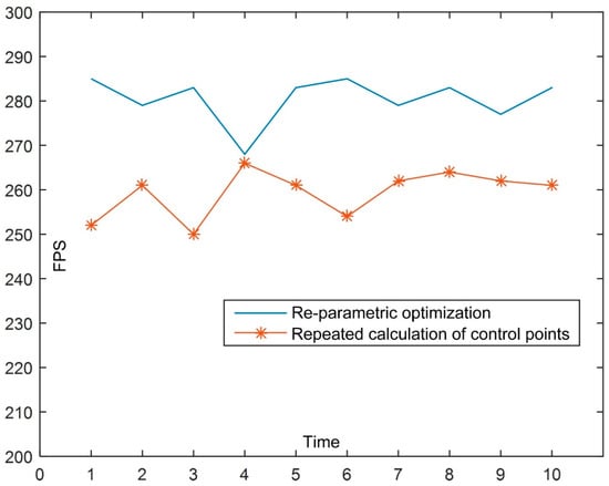 Considering that the Bezier surface definition requires known control points but the data set acquisition usually obtains mismatching of surface points, this study re-parameterized Equation (4) so that the coordinates of the data set can be directly brought into the formula for Bezier surface modeling and calculation, thus saving a lot of the control point coordinate calculation process. Through experimental calculation, under the same conditions, the model’s FPS (frames per second) without an improved calculation process is about 250 FPS and the improved FPS is about 280 FPS, which improves the system efficiency.