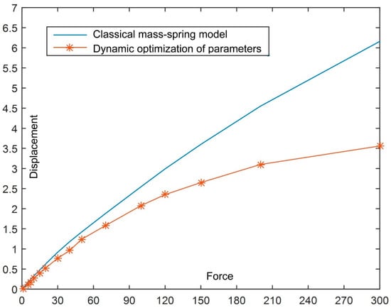 It can be seen from Figure 11 that after the parameter dynamic mapping using Equation (12), the displacement of the particle was smaller than that before the optimization, and the larger the force, the larger the displacement deviation between the two, that is, the change amount of the particle displacement gradually decreased with the increase in the force. It was shown that the parameter dynamic method could indeed improve the nonlinear fitting ability of the mass–spring model to a certain extent, and the nonlinear mapping of the parameter dynamics could also be extended.