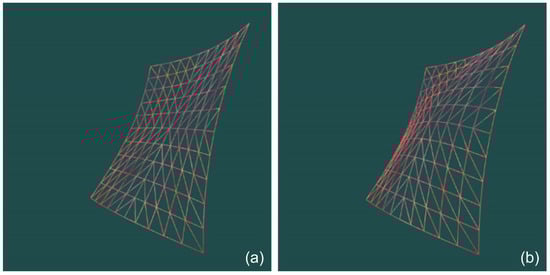 The Bezier method has a very fast calculation speed in the case of a few control points and can ensure that the surface is smooth in the case of any control point arrangement. It is generated by interpolating the control points based on the Bernstein basis function, given as Equations (2) and (3). At the same time, the model established using the Bezier method is completely and only determined by the relative positions of the control points. Therefore, this method can ensure the same modeling with the control point data and facilitate surface reconstruction. Therefore, the Bezier method is the basis of many commonly used methods [,]. This study gave full play to the advantages of the classical Bezier method, and at the same time, puts forward some improved ideas and methods for its shortcomings.