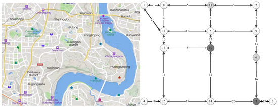 To verify the effectiveness of the proposed model and algorithm, the network of Jiulongpo district in Chongqing was taken as an example for checking calculation, as shown in Figure 2. The network consists of 15 nodes and 20 links. There are two refueling and gas station nodes and two charging station nodes in the node. Nodes 6 and 11 represent charging station nodes, and nodes 7 and 10 represent refueling and gas station nodes. Nodes 1 and 4 are the starting points, nodes 2, and 3 are the ending points. Therefore, OD pairs can be represented as 1→2, 1→3, 4→2, and 4→3. There are significant differences in the capacity and flow of different links, which will inevitably have an important impact on the choice of vehicle route. Path-link are divided into three grades, and different grades are represented by arrows of different thicknesses. Path-link 1, 2, 5, 6, 7, 10, 12, 13, 14, and 19 are the first level; path-link 3, 9, 11, 12, 15, 17, 18, and 20 are the second level, and path-link 4 and 8 are the third level.