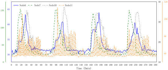 According to the link level location of each node, the peak data on the actual corresponding grade road is selected for calculation. Figure 3 shows the negative effect changes of four stations from Monday to Thursday from 6:00 a.m. to 12:00 a.m. It can be seen that the negative effect cost reaches a high peak in the morning peak period of nodes 6 and 10. In addition, the peak hour of node 11 is not obvious, showing a high level of negative for a long time, and the time points at which the four nodes lead to the highest peak are different. In addition, it can be observed that node 7 encounters the peak in a short time, while node 6 is on the contrary. Node 6 has a transition time before the peak and drops rapidly after the peak, and node 10 has a transition time before and after the peak hour.