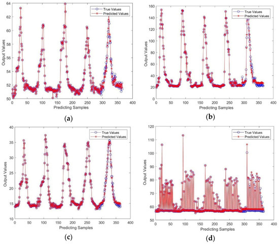 Predicted and real GA-BP of negative effect at each node. (a) Predicted and true values of node 6. (b) Predicted and true values of node 7. (c) Predicted and true values of node 10. (d) Predicted and true values of node 11.