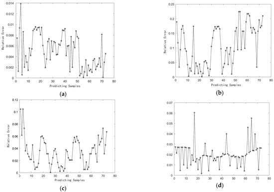 Comparison of error between GA-BP predicted value and real value of negative effect at each node. (a) Average relative percentage error of node 6. (b) Average relative percentage error of node 7. (c) Average relative percentage error of node 10. (d) Average relative percentage error of node 11.