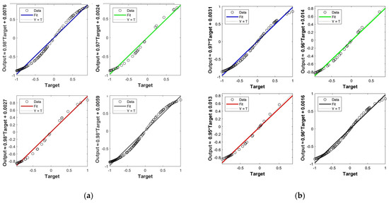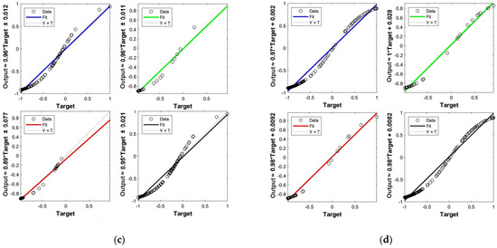 Regression fitting of GA-BP prediction results in a negative effect at each node. (a) Linear regression fitting of results of Node 6. (b) Linear regression fitting of results of node 7. (c) Linear regression fitting of results of Node 6. (d) Linear regression fitting of results of node 7.