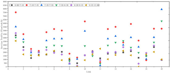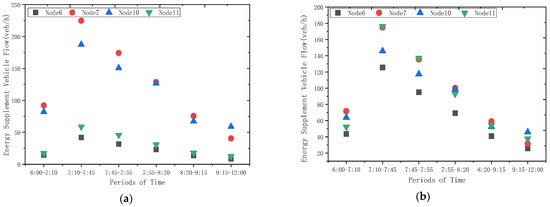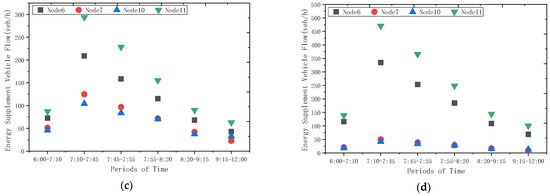 The traffic flow results obtained by using the flow assignment algorithm are shown in Figure 8. It can be seen that the traffic flow of each link is almost the highest in the time period of 7:10–7:45, followed by 7:45–7:55. In addition, links 9 and 12 are maintained in the low traffic flow range. According to the flow and energy supplement of the four stations, the energy supplement flow of the four nodes in six time periods is summarized and compared, as shown in Figure 9a. From the perspective of the time dimension, the number of energy-replenishing vehicles is the largest in the same period of 7:10–7:45, while there are fewer vehicles in the earliest and noon periods. The comparison trend with the overall driving traffic flow is roughly the same, and the traffic at node 6 is the smallest, and the volume of node 7 is similar to that of node 10, which is determined by the vehicle flow of energy supplement demand. At present, the market share of fuel vehicles still accounts for the absolute counterpart. The same is true for the charging station. Node 11 has a higher flow than node 6. Node 6 is located on the expressway and in the Yangjiaping business district; accordingly, the flow is greater. The reason why node 7 has more traffic than node 10 is determined by the link level and the distance from the end point [25]. In addition, with the gradual increase of electric vehicle market penetration, the proportion of charging demand and energy-replenishing vehicles in the subsequent network will gradually increase. Therefore, the station traffic with different energy-replenishing vehicle types and interest rates is compared. As shown in Figure 9b–d, the traffic to the charging station node is basically the same when the market share is 30%. When the market share is 50%, the traffic flow at the charging station node begins to exceed that at the gas filling station node and completely exceeds that at 80%, even greater than the current gap between the two types of traffic flow.