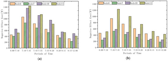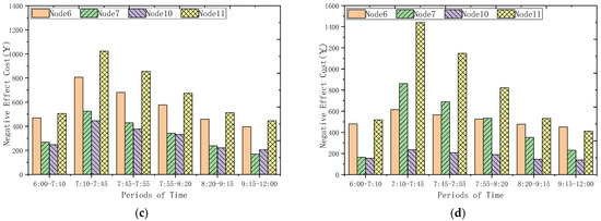 After obtaining the flow of energy replenishing vehicles, the negative effect cost of each energy replenishing station and the corresponding path can be calculated, as shown in Figure 10a. The cost of the negative effect becomes higher in the two time periods of 7:45–7:55 and 7:55–8:20. The total negative effect cost in the total measurement time is 16,821.52 ¥, including 4,464.75 ¥ for station 67,471.88 ¥ for station 77,659.88 ¥ for station 10 and 5,408.92 ¥ for station 11. As can be seen from Figure 10, with the increase in electric vehicle market share, the overall negative effect level is also gradually decreasing. When the market share of electric vehicles is 30%, the negative effect cost is 12,281.23 ¥, a year-on-year decrease of 26.99%; when the market share of electric vehicles is 50%, the negative effect cost is 11,197.77 ¥, a year-on-year decrease of 33.43%; when the market share of electric vehicles was 80%, the negative effect cost was 11,885.71 ¥ a year-on-year decrease of 29.34%. However, with the increase in the number of electric vehicles, the problem of queue increases and time delay caused by the long charging time of charging stations becomes more and more obvious. How to reduce the waiting time and speed up the energy supplement efficiency of energy replenishment is an interesting problem to be considered in the future.