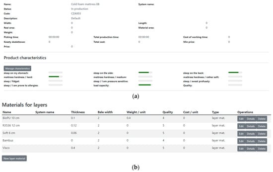 In the analysed case study, each of the customised products, which are mattresses, is identified by the name [name] and the system code [code] used in the ERP system; the mattress consists of a number of layers; the layers have different functions and are made from different materials and accessories. The materials from which the individual layers are made have their own unique names [name], and it is assumed that each variant of the material, for example, the same foam with different thicknesses, is a separate material. The materials have a precise thickness [thickness] and bale width in which they are supplied [bale width]. Each material must have a specific weight [weight per unit] and cost per unit [cost per unit] of surface area. Therefore, the most important parameters in the so-called “cyber world” (Figure 1) could be defined.