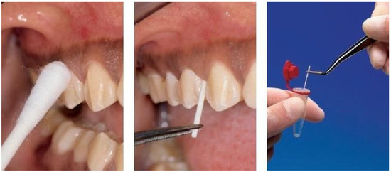 Gingival crevicular fluid was collected from all patients in the study to take samples of bacterial DNA. Sterile endodontic paper points (Caulk-Dentsply, Milford, CT, USA) were used to sample the appropriate amount. After isolating the recording site and removing the plaque for 10 s, they were inserted into the gingival fissure at 180° to the tooth surface (Figure 1) [20].