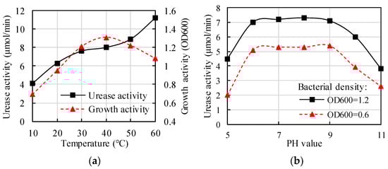 Temperature is the key factor in the success of MICP technology on soil treatment [50]. A change in temperature will affect the growth of bacteria, the activity of microbial enzymes, the biodegradation of bacteria, and the process of binding precipitation, thus affecting the final curing effect. Figure 2a shows the changes of urease and growth activities of BP at different temperatures. An absorbance index at the 600 nm wavelength (OD600) was wildly applied to evaluate the density and growth activity of the BP solution. It found that the growth curve of BP was different when the temperature varied from low to high [51]. It is generally believed that the growth of BP is inhibited at low temperatures, while the urease activity of BP decreases at high temperatures [52,53]. Therefore, the BP should be cultivated under a suitable growth environment (temperature).