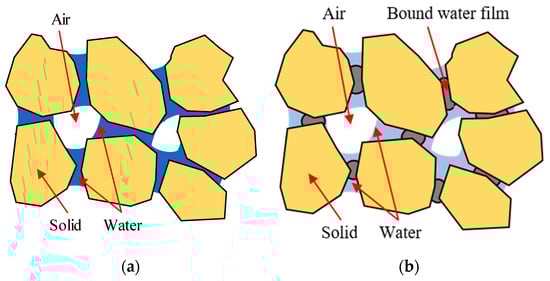The unsaturated soil exists widely in nature since most of the soil above the groundwater level is in an unsaturated state. Due to the differences in the medium and molding method, the soil has special structure and stress state. There are two types of theory frames to describe mediums in unsaturated soil. Figure 3a considers the unsaturated soil as a three-phase soil, including a solid phase (soil particles and some bio-cementitious substances), a liquid phase (water and aqueous solution), and a gas phase (air and water vapor, etc.). However, with the further study of unsaturated soil mechanics, unsaturated soil is considered as a four phase structure [80]. In addition to the solid, liquid, and gas three-phases, the liquid gas interface is also added as an independent phase. This independent phase can also be called the bound water membrane, as shown in Figure 3b. The nature of the liquid gas interface is not only different from that of water, but also different from that of gas. It is an independent phase. This phase is called the shrink film in surface chemistry. The morphology of the water pores and gas pores of unsaturated soil is closely related to the water content (saturation) of unsaturated soil [81].