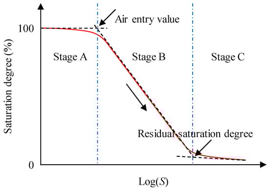 Matrix suction is the main reason why unsaturated soil is different from saturated soil, and it is also a key factor to reflect the mechanical properties of unsaturated soil [83]. The SWCC is a conceptual and interpretative tool to describe the soil water holding capacity when water content changes with suction [84]. SWCC defines the relationship between suction (matric suction), volume water content (θ) or saturation (Sr) of unsaturated soil. A typical SWCC is shown in Figure 4 (determined by the change in water content). The suction state (abscissa of the SWCC) can be expressed by the total suction of the soil water potential. In the high humidity state, the matrix suction (ua − uw) is used, and in the low humidity state, the total suction is used. Since there is little difference between the total suction value and the matrix suction in the low humidity state, the entire SWCC is often expressed by the matrix suction.