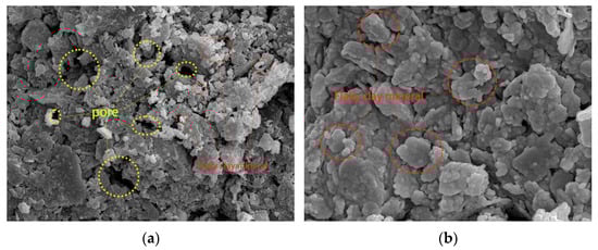 Micromorphology of untreated sand soil: (a) pore; (b) flaky clay mineral.