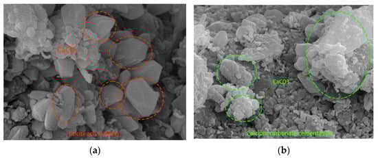 Elmaloglou et al. [102] observed the microscopic morphology of the MICP of the experimental device under different solid particle compositions. It was found that the CaCO3 crystals mainly play the role of encapsulation and can evenly fill the internal pores of soil samples. The permeability of ordinary sand can be reduced by three orders of magnitude due to the CaCO3 in the pores after treatment. Porter et al. [103] investigated the morphology of the sand column after curing with BP and found that CaCO3 played a bio-cementing role in greatly improving the connection strength between sand grains. SEM results show that a layer of white and dense hardened shell formed on the surface of the modified soil sample, and the generated CaCO3 presented a lamellar cleavage [104]. In addition, given that the solubility of CaCO3 is small, the MICP process is very helpful to improve the water stability of soil.