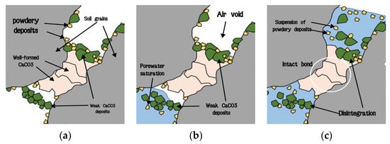 MICP soil infiltration diagram: (a) MICP soil diagram before wetting, (b) water infiltration into the pores, (c) saturated state.