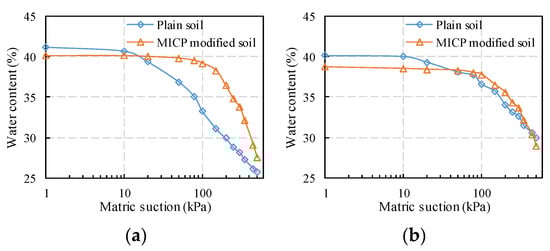 MICP technology mainly changes the water holding capacity of unsaturated soil by generating CaCO3 precipitation to bio-cement soil particle pores [109]. Bo et al. [110] compared the water absorption of soil samples before and after treatment with MICP technology and found that the water absorption of soil samples after treatment is far greater than that of untreated soil. MICP treatment significantly improved the soil water holding capacity and anti-cracking capacity. Figure 8 shows the SWCCs of plain soil, and improved expansive soil are compared under the conditions of compactness of 90% and 95%, respectively. Results show that the pore will become smaller with the increase in compaction degree, thus changing the water holding capacity of soil samples. The SWCC of soil improved by MICP technology changes greatly compared with that of expansive soil before treatment, and the saturated water content of soil improved by MICP technology is higher than that of plain soil. It indicated that the volume of water content of the improved expansive soil changes less under the same matrix suction change, the water holding capacity was stronger, and the water stability was better.