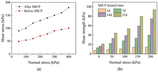 Chittoori et al. [118] demonstrated that the shear strength and unconfined compressive strength of expansive soil had been significantly improved after improvement by the MICP method; the plastic limit water content of expansive soil had increased; the liquid limit water content, plastic index, and expansion rate had decreased; and the microstructure had changed significantly. Therefore, MICP technology is an effective technical means to improve the compressive strength, shear strength, and free expansion rate of unsaturated soil through laboratory tests. Figure 9a is the change in shear stress with the normal stress of soil samples before and after MICP treatment. It shows that the shear strength of expansive soil after MICP treatment has been significantly improved, and the increase in cohesive force of expansive soil samples before and after treatment is far greater than the increase in the internal friction angle. Figure 9b presents the change in shear strength with the curing days of MICP. It can be seen that MICP technology will significantly improve the shear strength of soft soil, and its shear strength will gradually increase with the increase in curing days (3d–21d).
