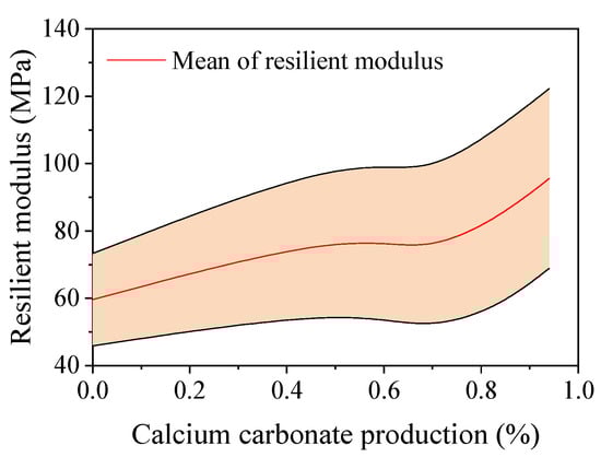 The MR of soil describes the resilient deformation characteristics of soil subgrades under dynamic traffic loads [119]. In the MICP process, CaCO3 precipitation bio-cemented the soil particles and filled the pores between soil particles, leading to the increase in coarse particle content and the decrease in fine particle content in soil. Therefore, with the decrease in fine particle content, the dynamic resilient modulus of improved soil increases. In order to achieve biological stability, Moradi et al. [120] adopted the microbial-induced calcite precipitation (MICP) method. The result shows that the elastic behavior of the treated fine-grained soil was similar to that of coarse grained soil, and the MR of treated soil evidently increased. Bing et al. [121] found that the sensitivity of the MR of the stabilized fine sand to confining pressure decreases when the content of CaCO3 increases. The increase rate of the MR of the saturated stabilized soil is greater than that of the unsaturated stabilized soil. The reason for this structure is due to the improvement of MICP technology. The generated CaCO3 crystals will block and bio-cement the soil particle pores, and the pore volume will decrease with the increase in CaCO3 content. Soil particles can contact closely through CaCO3 crystals, and the MR increases accordingly. Figure 10 shows the relationship between dynamic MR and CaCO3 output. It can be seen from the figure that the output of CaCO3 is closely related to the dynamic MR. The minimum value of dynamic MR increases by about 50% at most, and the maximum value increases by about 66.8%.