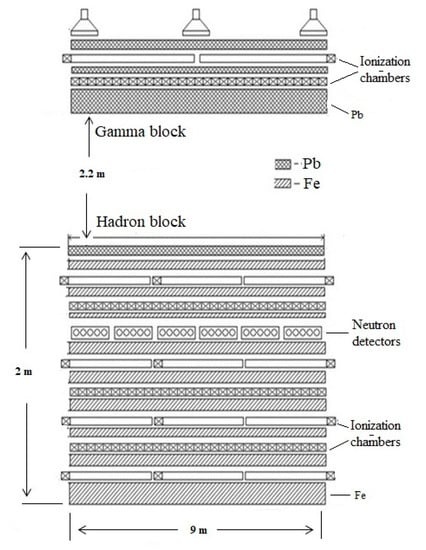 - Iskakov, B.A.; Argynova, A.K.; Beisenova, A.D.; Zhautykov, B.O.; Idrisova, T.K.; Novolodskaya, O.A.; Piscal, V.V.; Ryabov, V.A.; Sadykov, T.K.; Sadykov, J.T.; et al. “HADRON-55” complex setup for study of hadron interactions within the central part of cosmic ray extensive air showers (EAS) cores. J. Instrum. 2020, 15, 12002. [Google Scholar] [CrossRef]