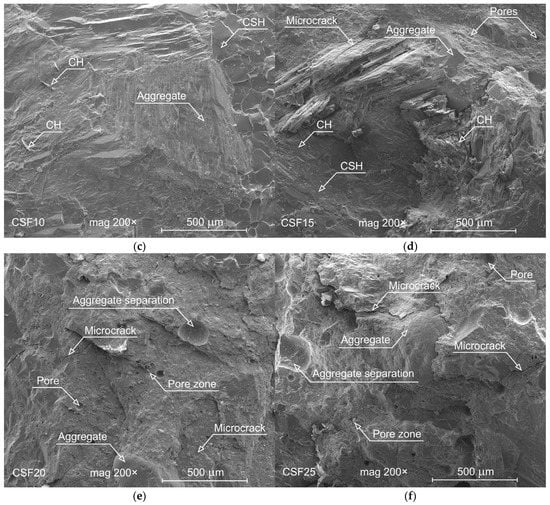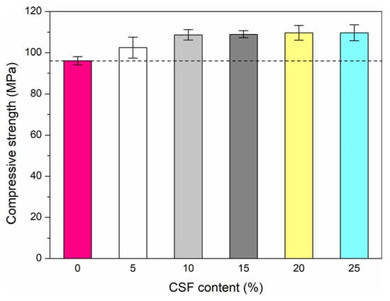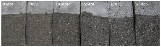 - The compressive strength increases in the range of 6.5–14% with increasing CSF content compared to reference specimens without the implementation of CSF.