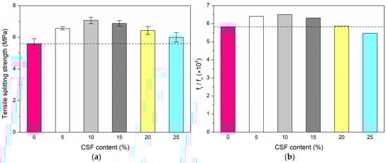 - The tensile splitting strength of HPC improves significantly with the addition of CSF. Tensile splitting strength increases in the range of 7–26% in comparison with the reference specimens. In the tested HPC, the values of the tensile splitting strength are in the range of 5.5–6.5% of the compressive strength, while for normal strength concrete this value is about 10%.