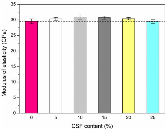 - The elastic modulus improves gradually as the CSF content increases to 10%, and then decreases to 25% CSF. It increases slightly in the range of 3–4.5% with the 5–20% addition of CSF, compared to the reference HPC. On the contrary, the modulus of elasticity is decreased by 0.5% for 25% CSF.