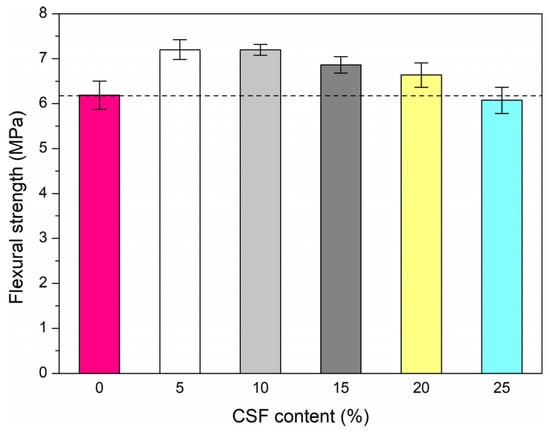 - Replacing the cement with 5–20% CSF in HPC significantly increases the flexural strength in the range of 7–16% compared to reference HPC. In contrast, for 25% CSF content, the flexural strength decreases by 2%.