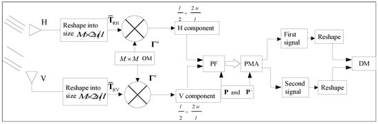 In this manner, interferences for both polarization signals were eliminated. As in Equation (12), both and resulted from the addition of two signals, which would be separated for demodulation. Here, the corresponding rows of and were transformed into pairs for polarization filtering. The k-th pair was taken as an example, which could be written, as follows: