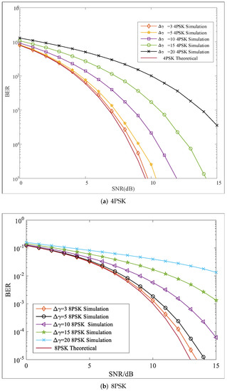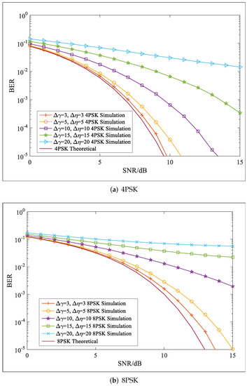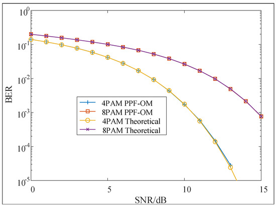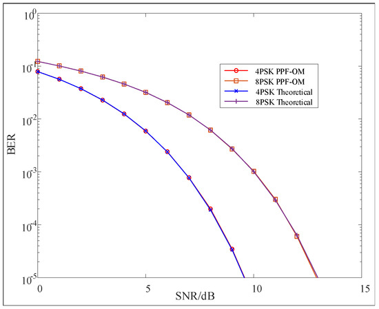 Next, 4PAM and 8PAM were replaced by 4PSK and 8PSK, respectively, and the BER curves are shown in Figure 5. We found that the BER curves approached the theoretical ones, which had the same results as the PAM technique.