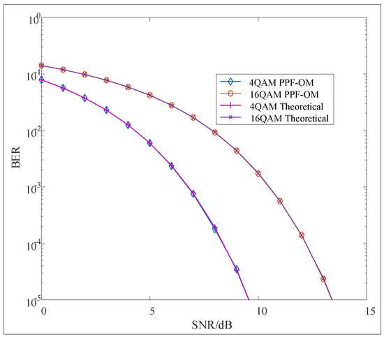 Furthermore, we utilized 4QAM and 16QAM to modulate the two information sequences, and the BER curves are shown in Figure 6. The two BER curves approached the theoretical ones. Overall, regardless of the modulation techniques used in the PPF-OM scheme, the two signals could be demodulated without interference and approach theoretical values. The simulations demonstrated the validity of the proposed scheme for eliminating the PDL, which was consistent with the theoretical derivations.