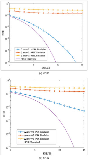 In this simulation, the security performance of the PPF-OM scheme was evaluated in terms of the BER performance when there were errors in the PSs. Both 4PSK and 8PSK were utilized to modulate the two information sequences, which yielded the 4PSK and 8PSK symbols, respectively. Here, the errors were added to the polarization parameter while th other parameters were distortionless. The BER curves of 4PSK and 8PSK with are shown in Figure 8. We found that a larger error in would led to a worse BER. In addition, if there were errors in both parameters and , the BER performances worsened, as shown in Figure 9, where the BER curves with are plotted. If there were errors in both parameters, the BER performance would be worse than that shown in Figure 8. Moreover, larger errors in both and would lead to worsening BER performances. As analyzed in Section 5, for Eve, the polarization parameters were difficult to obtain, and the modulation techniques were unknown; therefore, the errors in polarization parameters were inevitable. Therefore, in this case, the BER performance of Eve would be worse.