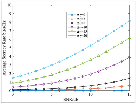 In this simulation, the security performance was evaluated in terms of the average secrecy rate (ASR). Both 4PSK and 8PSK were utilized to modulate the two information sequences, which yielded the 4PSK and 8PSK symbols, respectively. We assumed Eve could correctly reshape the received signal vectors into the matrices and as well as obtain the matrices correctly. However, the PSs that had been used to process the signals were unknown. As analyzed in Section 5, the PSs were difficult to obtain, and when there were errors in PSs, based on Equations (29) and (30), there would be interferences in the recovered signals. Therefore, the ASR was improved, as shown in Figure 10, where the ASR curves are plotted. Here, the errors were added only to the polarization parameter while the other parameters were distortionless. When the error was zero, the ASR equaled zero and did not change with the SNR. In addition, when the error was non-zero, the ASR increased alongside the SNR, and the larger error in led to a larger ASR. These simulation results were consistent with the theoretical derivation process. Therefore, with the PPF-OM scheme, a positive ASR was ensured, and the transmission security was enhanced.