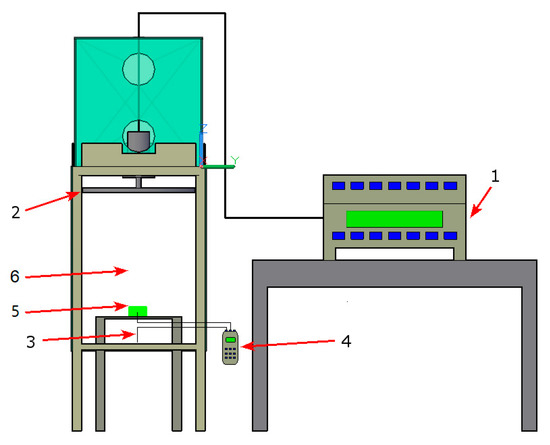 Scheme of the research stand: (1) Ultrasound generator; (2) vibrating plate; (3) thermocouples; (4) datalogger; (5) sample; (6) air.