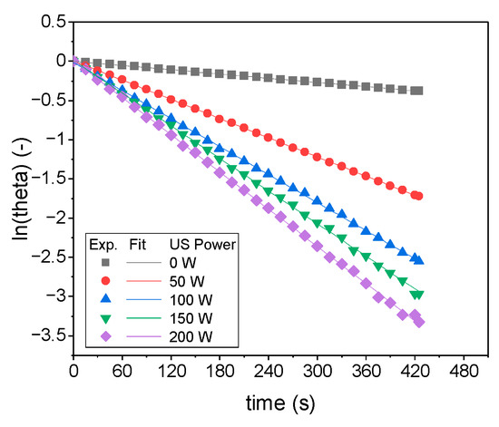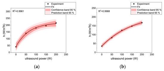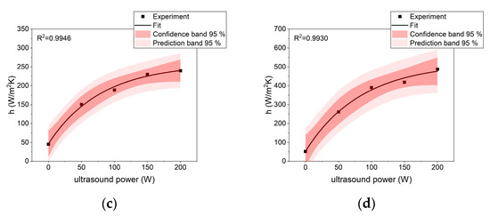 All the results obtained were approximated by a linear function defined by Equation (20). The approximations obtained were very accurate as the coefficient of determination R2 ranged from 0.9994 to 0.9999. On the basis of the above approximations, the values of the slope of the straight line (Equation (20)) were obtained. Then, using Equation (21), the values of the heat transfer coefficient h were calculated. The values obtained for the coefficient h for all four samples and all applied ultrasound powers are presented in Table 2.