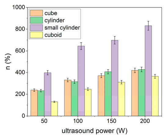 In Figure 5, the heat transfer enhancement coefficient n calculated in accordance with Equation (22) is presented for particular shapes and processes. The values of the heat transfer coefficients were taken from Table 2, h0 for processes without ultrasound and hx for processes with ultrasounds. It is clearly seen that the application of ultrasonics accelerated the cooling and increased the heat transfer coefficient for the small cylinder. For the cylinder and the cube, the intensification was lower but at a level similar to each other. The smallest increase was observed for the cuboid. Taking into account the influence of the ultrasound power, it may be stated that increasing the ultrasonic power results in the growth of the heat transfer coefficient. However, the highest gain was observed for 50 W and 100 W, which is particularly visible for a small cylinder. For 150 and 200 W, the heat transfer coefficient still rises, but the change in reference to the previous ultrasonic power is smaller.