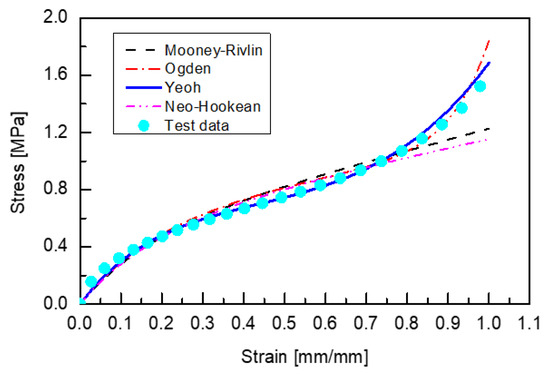 - As a result of the equi-biaxial displacement control test of the natural rubber specimen, it was found that the hyperelastic behavior equation with the highest correlation coefficient for the stress–strain curve was the Yeoh model. Therefore, the material constants of polyurethane were predicted using this equation and used for NFEA;