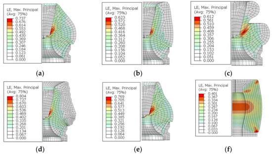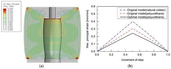 As a preliminary design step for optimization from the existing natural rubber spring, NFEA carried out a conceptual design for six types of cross-section shapes. Figure 4 shows the maximum principal strain (MPS) distribution for six types of natural rubber cross-sectional shapes under the condition of an applied load of 3.4 kN based on the required design specification [2]. Figure 4f shape 6 shows the smallest MPS among them. This model is the model finally selected among the proposed cylindrical cross-sectional shapes in a limited height and diameter range and is called the original model from hereafter. Using this model, material constant prediction and optimal shape cross-section design were performed to reinforce the weak point of the spring and to reduce MPS. The advantage of reducing MPS is that it could increase the fatigue life for the spring [27,28].