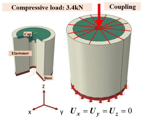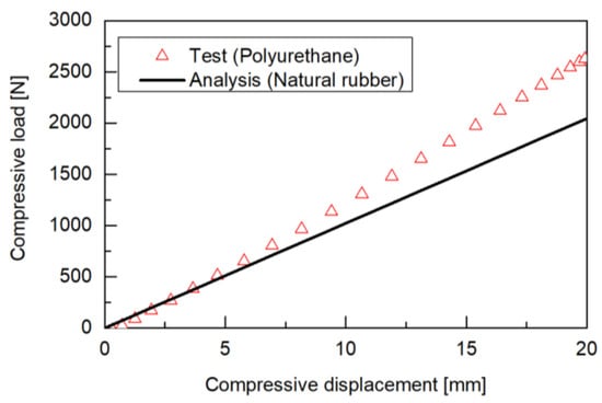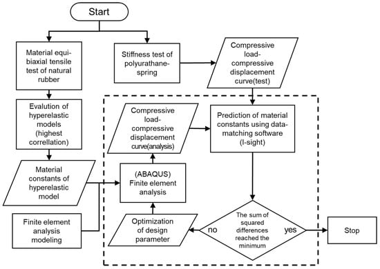 Figure 5 shows a flowchart of the process for predicting the material constants for hyperelastic behavior. First, the known material constants of the hyperelastic behavior of natural rubber were set as initial values, and the material constants were set as C10 = 0.318, C20 = −0.026, and C30 = 0.005 for the Yeoh model equation (shown in Equation (1)). To predict the nonlinear hyperelastic behavior of polyurethane materials without additional testing, the stiffness of this polyurethane spring should be obtained in the same shape as the existing cylindrical natural rubber spring.