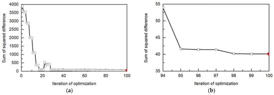 Optimization histories of sum of squared difference using HJA: (a) optimization history; (b) detailed view of optimization history.