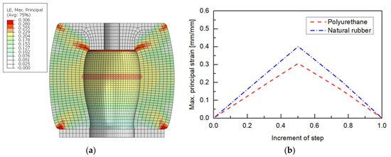 Figure 10 shows the results of the NFEA of the existing natural rubber spring under the boundary and applied load conditions. Figure 10a shows the distribution of the MPS in the cross-sectional shape of this spring, and Figure 10b shows the MPS history based on the analysis of step increment during compressive loading and unloading. In this analysis model, the element shape was an eight-node hexahedron (C3D8R), and the number of elements and nodes were 29,697 and 34,993, respectively. The strength of this spring was evaluated based on the MPS while considering the incompressibility and hyperelastic behavior of rubber materials in the large deformation range [19,20,21,22,23,24]. The weak point was near the contact point between the inner center and lower end of the spring, and the MPS for the spring under the maximum applied load was 0.306, as shown in Figure 10a. As shown in Figure 10b, the MPS of the polyurethane spring was approximately 23% lower than that of the natural rubber spring of the same hardness (Hs 45A). Therefore, the use of polyurethane material instead of natural rubber reduces the MPS, thereby increasing the soundness of the polyurethane spring.