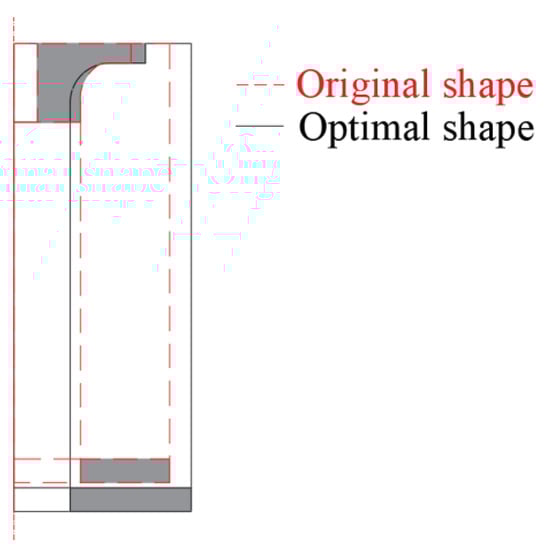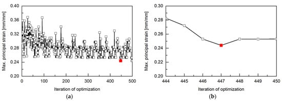 Figure 14a shows the distribution of the MPS for the optimal design of this spring, and Figure 14b shows the history of the MPS at the weakest point in the original drawing and the optimal design section. The MPS at the weakest point of the optimal design shape was 0.244, which was approximately 20% lower than the original shape (0.306), as shown in Table 6. In terms of the target stiffness, i.e., “20 mm displacement under a compressive load of 3.4 kN,” the compression displacement of the optimal shape was 20.01 mm, which was satisfied within the allowable error range, unlike the existing shape (compressive displacement of 25.8 mm), as shown in Table 5. For reference, Table 7 shows a comparison of the MPS values in the weak point based on the optimal algorithm. In this table, the optimal design result obtained using the MIGA yielded the lowest MPS, as compared with those of the OLH and HJA.