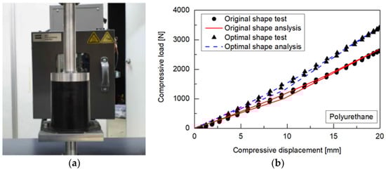 A compression displacement control test was performed on the polyurethane spring to verify the effectiveness of the optimized cross-section. Figure 17 shows the results of the compressive load-displacement test and analysis for the original and optimal shapes. Figure 17a shows a compressive load-displacement test using a tester rig. As shown in Figure 17b, the correlation coefficient between the analysis of the original shape and the test result was 0.911, and the correlation coefficient of the optimal shape was 0.928.