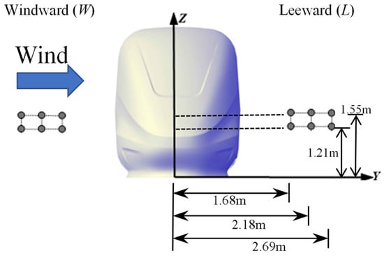 To explore the slipstream and flow feature of the present tested model, velocities were measured at a set of monitoring points. For both sides’ measurements, a rake of probes located on the leading-edge side of the bridge and the other one on the leeward side of the train. Measurements were taken at full-scale equivalent distances of y = 1.68, 2.18, and 2.69 m from both train lateral surfaces. From there, measuring points would follow the lateral positions mentioned before for the side measurements. Equivalently, considering that z = 0 corresponds to the top of the rail, side measurements along the z-axis were taken at full-scale values of z = 1.21 and 1.55 m. In this way, the slipstream flow property sampling positions are shown in Figure 2 and are used on either side of the train for the windward and leeward samples. The x-axis was defined along the track, the y-axis was the lateral direction, and the z-axis was the vertical direction. x = 0 corresponds to the tip of the train nose. Note that the measurements were conducted at both sides of the train model, to highlight the effects of the crosswind effect. The measurement plane was located at the center of the bridge model along the x direction.