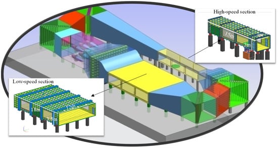 To investigate details of the interaction and the overlapping of the crosswind and slipstream, hundreds of experiments were carried out with a simulated crosswind provided by the CSU-1 wind tunnel (Central South University, Changsha, China), which is a closed wind tunnel with a reflux mode, essentially consisting of a series of fans with three columns and two rows as shown in Figure 4. The CSU-1 wind tunnel has a reflux mode and consists of two sections: a High-speed section and a Low-speed section that the wind funnels through into the vents in the pipe, blows the test model, and is collected and returned by the return pipe [47]. The wind speed ranges from 0 to 20 m/s, and a good flow quality is adequate for wind engineering and industrial aerodynamic testing with a turbulence intensity level of less than 0.3%.