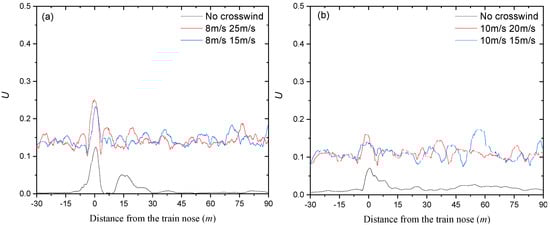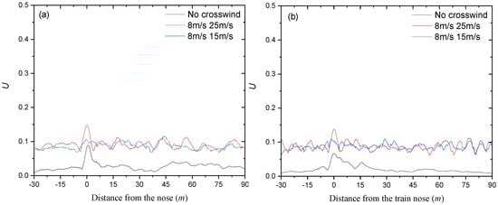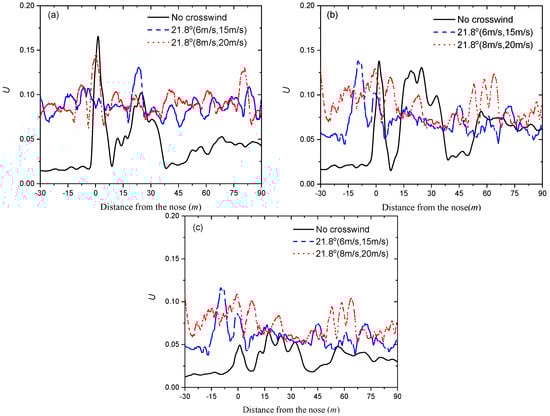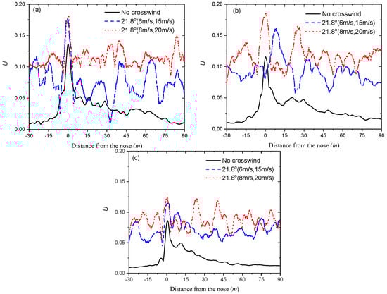 The U on the windward side of the train for the no-crosswind and 21.8° crosswind cases at z = 1.21 m are shown in Figure 8. In the no-crosswind case, the highest peak velocities are U = 0.173, U = 0.148, and U = 0.08, respectively. The peak U in the no-crosswind case is higher than the crosswind in the 21.8° cases at y = 1.68 m and y = 2.25 m. At y = 2.81 from the train side, the velocity in the no-crosswind and 21.8° cases decreases in the nose region due to the train effect wane. Furthermore, the velocity in the no-crosswind case is lower than in the crosswind cases.