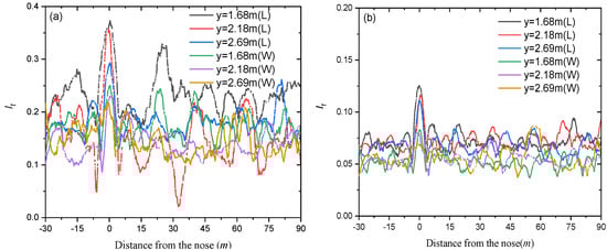 Turbulence intensity (It) of the slipstream around the train can be used as a measure of the gustiness of the flow, which is defined as the ratio of the standard deviation of the slipstream velocity ensemble to (1—ensemble mean normalized slipstream velocity) [18]. The results are shown in Figure 10 for two measurement heights. Unsurprisingly, the higher measuring points have the lower turbulence intensity, with the intensities for the z = 1.55 m measurements being significantly less than for the z = 1.21 m measurements. The intensities for turbulence are surprisingly diverse and complex with distance along the train, reflecting that the slipstream was disturbed by the crosswind flow over the bridge deck. For the turbulence intensities on the leeward side, the intensities are much higher as would be expected, with the values for the z = 1.21 m measurements being higher than those for the z = 1.55 m measurements. For both sides of the train, there is considerable variation in intensity along the train. However, it can be seen that the magnitudes of the peaks for the leeward side are significantly greater than for the windward side—for example, the turbulence peaks for the measurements made at 1.21 m height are around 0.21 for the windward side and 0.36 for the leeward side. For the leeward side, the slipstream will be convected onto the measurement instruments by a crosswind; thus, the results are as expected. It on the leeward side is very different from the no-crosswind case [37], suggesting the crosswind has a lasting impact on the turbulence intensity and stacks up the train-induced turbulence to a higher value Relatively higher It occurs in the area around the train nose on the leeward side. This is expected because the train-induced flow increases the turbulence generation, thus increasing It at a train nose location (Figure 10a). As the flow moves backward along the train, It reduces gradually. Remarkably, the It in Figure 10a experiences multiple l peaks that disappears in Figure 10b, and the turbulence distribution along the train more chaotic. However, it does suggest there is an influence of the crosswind flows around the bridge and vary between measure points.